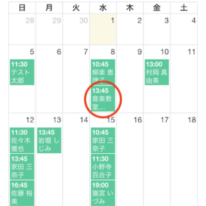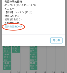 ここで確認すれば、時間を勘違いすることなどはないです。レッスン時間も表示されるので予約した証拠にもなります。レッスンの予約をした際に、必ず生徒様にもアプリ及びブックマークから確認してもらうことで、ダブルブッキングのトラブルは避けられます。