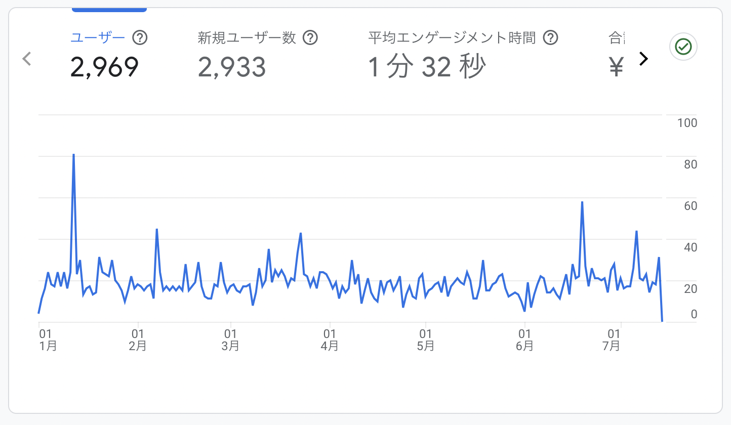 平均エンゲージメント時間とは、サイトを観覧した時間です。1:00で優秀なホームページと言われてますが、結構見られてますね。いい感じ。