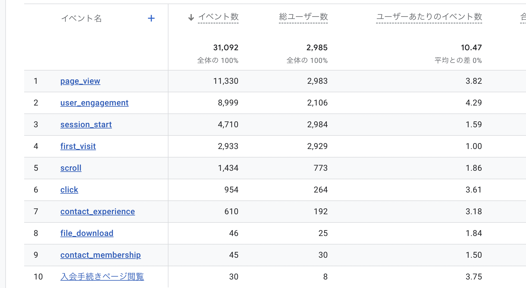 7番のcontact_experienceが体験レッスンの申し込みを押した人数。192人の人が合計610回申し込みボタンを押しているという事になりますね。