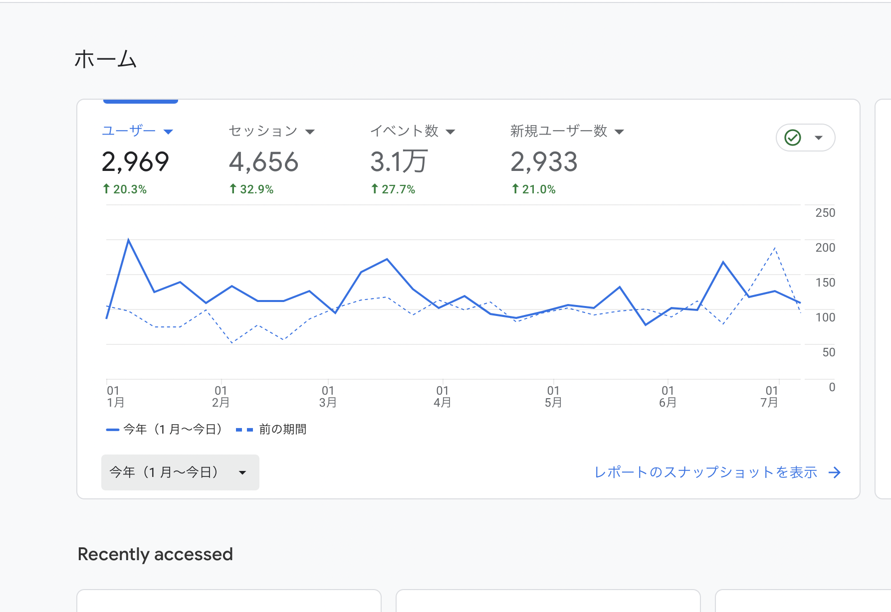 現在新規訪問、2024年1月〜現在までで4656回ホームページにアクセスがあり、新しくホームページに来た人が2933人、クリックやスクロールなどのアクションが31000回行われています。