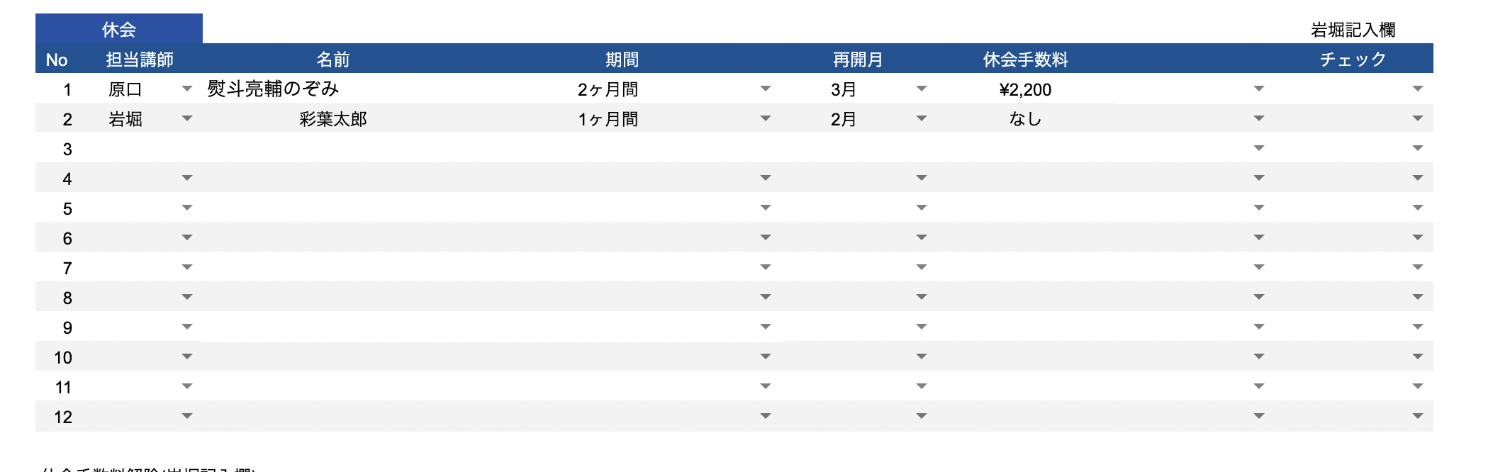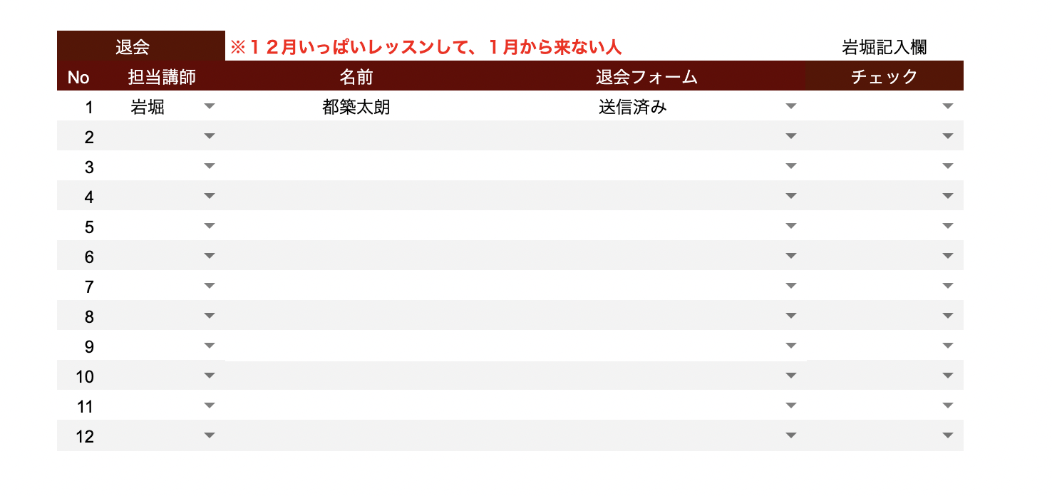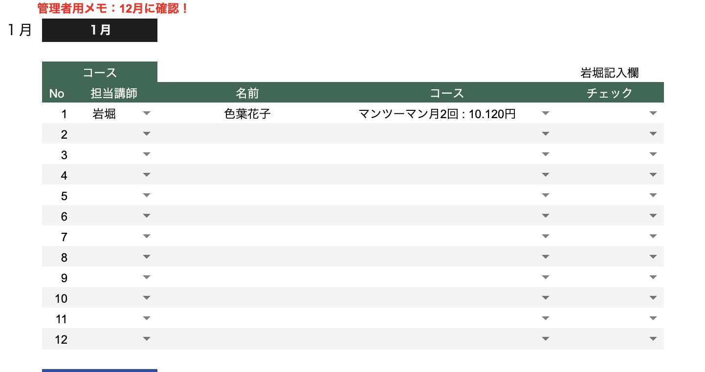 現在のスプレッドシートの記入方法が、管理者目線になっており分かりづらいとのご意見を受け、来年1月から講師目線の書き方に変更します。